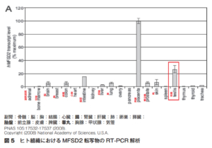 図 5 のヒト組織における MFSD2 転写物の解析により、一過性の組織である胎盤を除いて定常組織では、睾丸(哺乳類では精子を産生する精巣)に MFSD2 が、飛び抜けて高い発現率が認められる。
