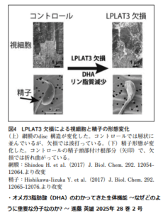 LPTAT3は、DHAをリン脂質に取り込む酵素です。(簡単に言えば、この酵素がなければ細胞にDHAを取り込むことができません。)そのLPTAT3を持たないマウスでは、上図の通り視細胞と精子が正常内形態となりません。