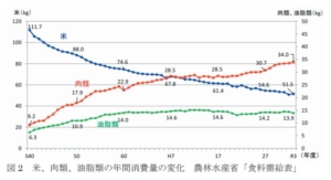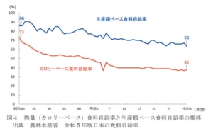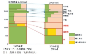 日本の食料自給率は、熱量ベースで 2010-13 年度には 39%に低下しており、果実・野菜、大豆、小麦、油脂類、畜産物等の不足分は諸外国からの輸入に頼っている(図 3、4)。