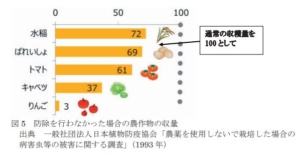 病害虫や雑草から農作物を守るためには、品種改良や輪作による耕種的防除、雑草や虫を食する鳥や虫を利用した生物的防除、ビニールシートや敷きわらによる雑草抑制、防虫ネットの利用や太陽熱で土壌消毒などがあるが、戦後開発された化学合成農薬は収量の増大や農作業に要する労働の軽減に大きく寄与してきた。果樹の場合は収量への影響が大きく、農薬を使用しなかったリンゴでは平均で 97%減収することが確認されている(図 5)。