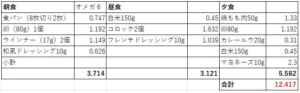 弁当←これは早弁:トンカツ(100g:5.98)+コロッケ2個(1.6)+白米(300g:0.9)+マヨネーズ(10g:2.3)合計10.7g