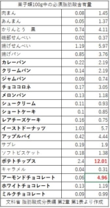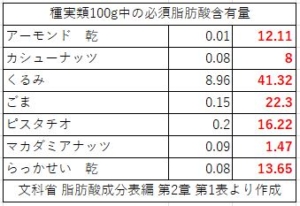 おそらく、ほとんどのヒトは上記よりも遥かに豊かな食事を摂られていることでしょう。また、それにプラスして何らかのおやつを口にしていると思います。そこで一例ですが、おやつに含まれる必須脂肪酸を添付します。