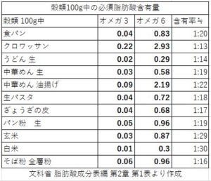 主食と言えば〝穀類″とくに米ですよね。また、パンやラーメン、うどん、ソバも主食のひとつです。そんな主食ですが、以下の通りオメガ6脂肪酸がとても豊富です。